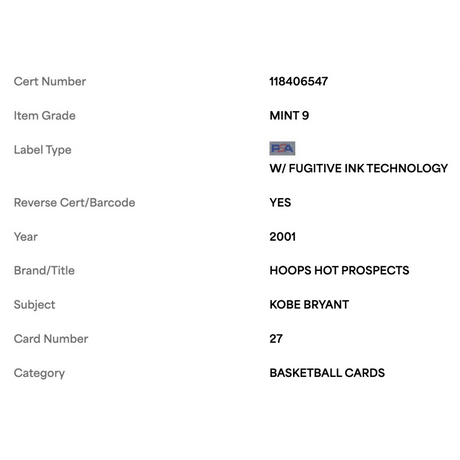 Kobe Bryant PSA 9 2001 Fleer Hoops Hot Prospects Card #27