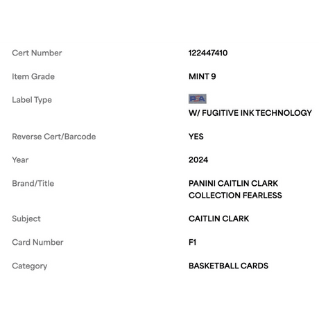 Caitlin Clark PSA 9 2024 Panini Caitlin Clark Collection Fearless Card #F1