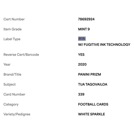 Tua Tagovailoa PSA 9 2020 Panini Prizm White Sparkle Rookie RC SSP Card #339