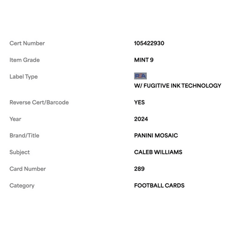 Caleb Williams PSA 9 2024 Panini Mosaic Rookie RC Card #289