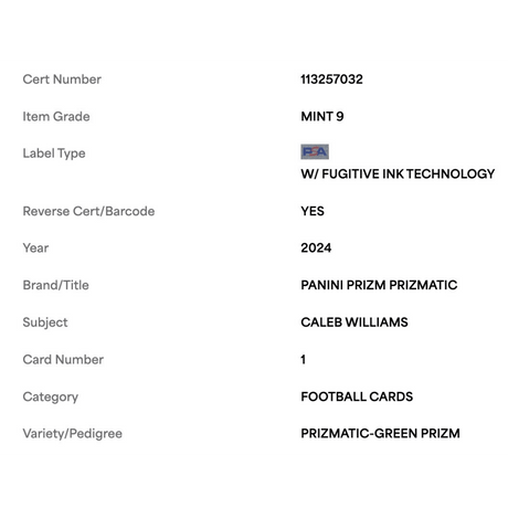 Caleb Williams PSA 9 2024 Panini Prizm Prizmatic Green Prizm Rookie RC Card #1