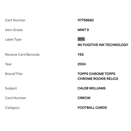 Caleb Williams PSA 9 2024 Topps Chrome Rookie Relic Card #CRRCW