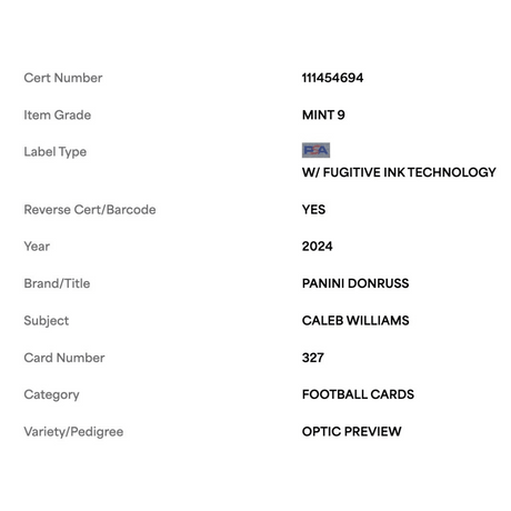Caleb Williams PSA 9 2024 Panini Donruss Optic Preview Rated Rookie Card #327