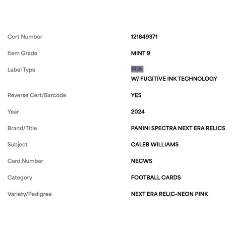 Caleb Williams PSA 9 2024 Panini Spectra Next Era Relic Patch Neon Pink Rookie RC #d/15 Card #NECWS