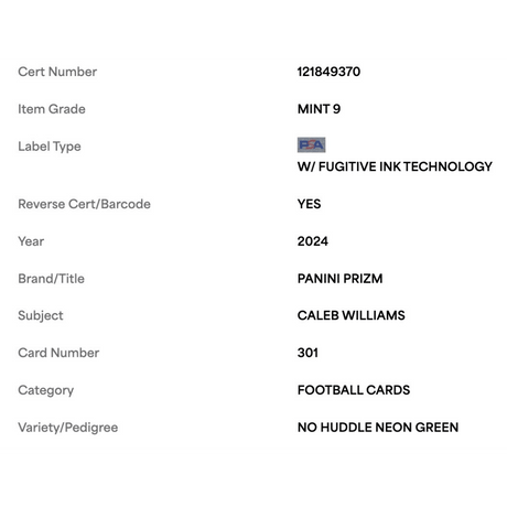 Caleb Williams PSA 9 2024 Panini Prizm No Huddle Neon Green #d/10 Card #301