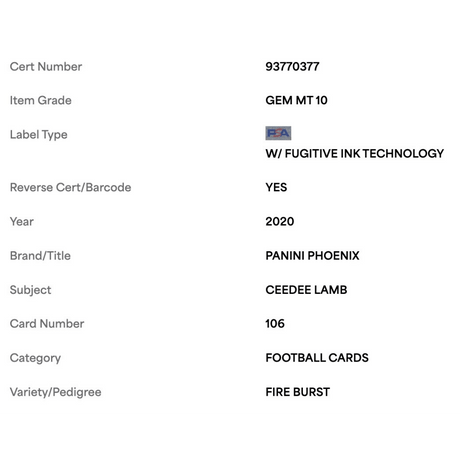 CeeDee Lamb PSA 10 2020 Panini Phoenix Fire Burst Rookie RC Card #106
