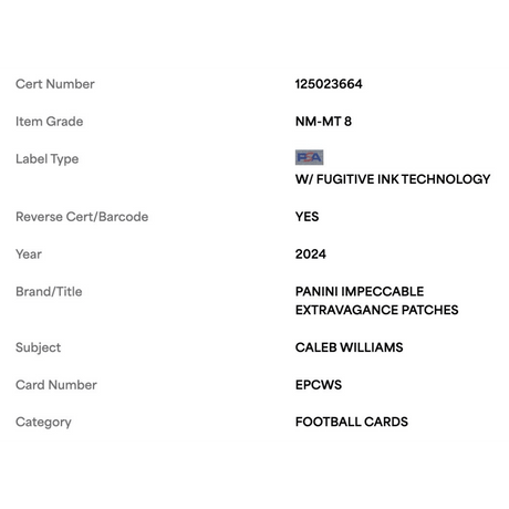 Caleb Williams PSA 8 2024 Panini Impeccable Extravagance Patch #d/ 49 Card #EPCWS