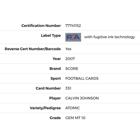Calvin Johnson PSA 10 2007 Score Atomic Card #351