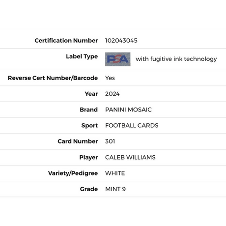 Caleb Williams PSA 9 2024 Panini Mosaic White Rookie RC #D/25 Card #301
