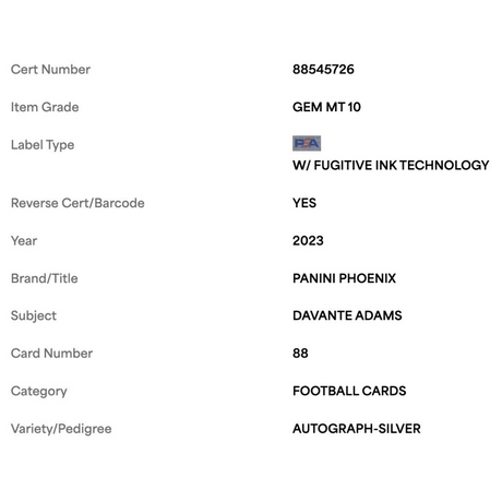 Davante Adams PSA 10 2023 Panini Phoenix Autograph Silver Card #88
