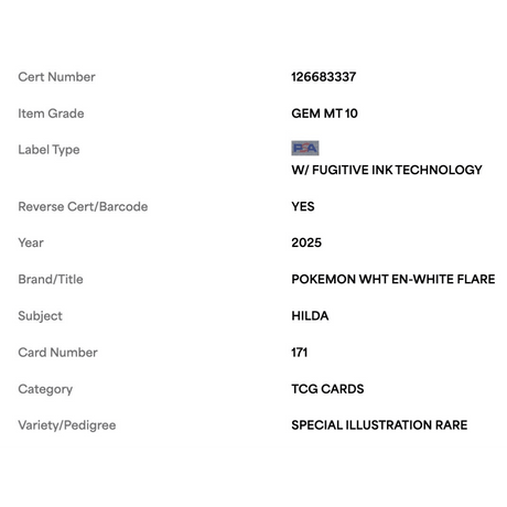 Hilda PSA 10 2025 Pokemon White EN- White Flare Special Illustration Rare Card #171