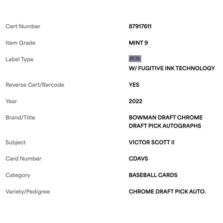 Victor Scott II PSA 10 2022 Bowman Chrome Draft Prospect Autograph Rookie RC Card #CDAVS
