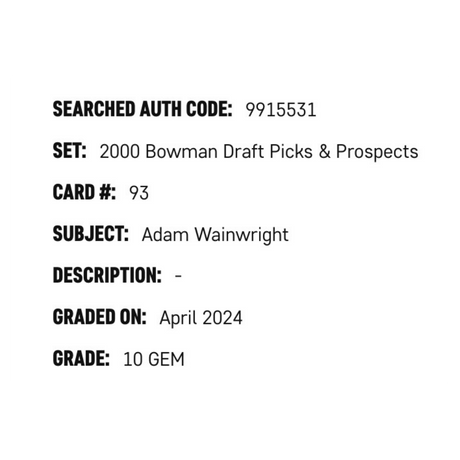 Adam Wainwright SGC 10 2000 Bowman Draft Picks & Prospects Card #93