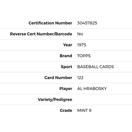 Al Hrabosky PSA 9 1975 Topps Card #122