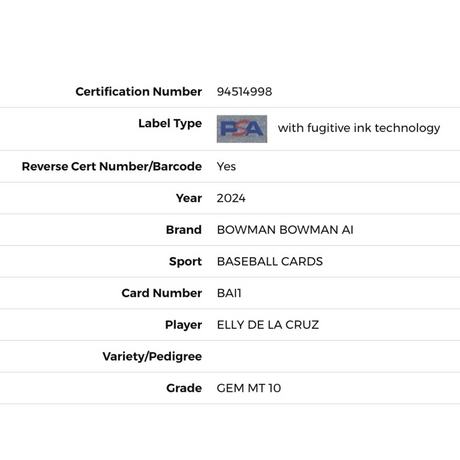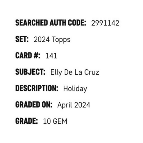 Elly De La Cruz SGC 10 2024 Topps Holiday Card #141