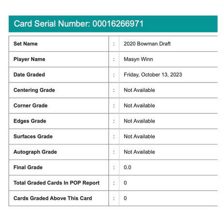 Masyn Winn Autographed Beckett BAS GEM MT 10 2020 Bowman Draft Rookie Card #BD59