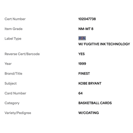 Kobe Bryant PSA 8 1999 Topps Finest w/Coating Card #64