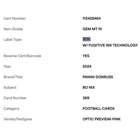 Bo Nix PSA 10 2024 Panini Donruss Optic Preview Pink Rated Rookie Card #369