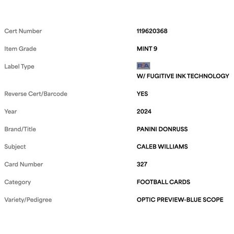 Caleb Williams PSA 9 2024 Panini Donruss Optic Preview Blue Scope Rated Rookie Card #327