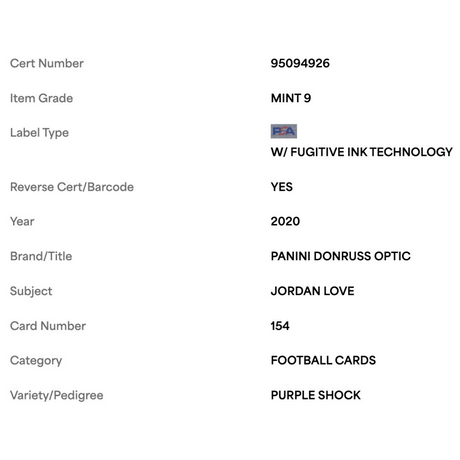 Jordan Love PSA 9 2020 Panini Donruss Optic Purple Shock Rated Rookie Card #154