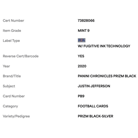 Justin Jefferson PSA 9 2020 Panini Chronicles Prizm Black Silver Rookie RC Card #PB9