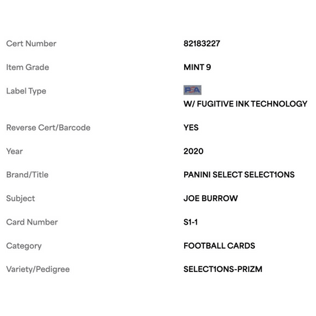 Joe Burrow PSA 9 2020 Panini Select Select1ons Prizm Card #S1-1