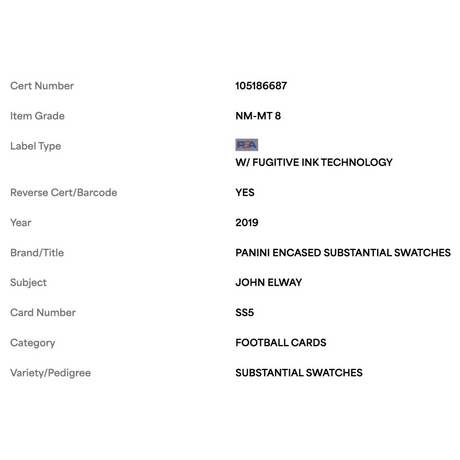 John Elway PSA 8 2019 Panini Encased Substantial Swatches #d/ 50 Card #SS5