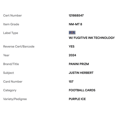 Justin Herbert PSA 8 2024 Panini Prizm Purple Ice #d/ 225 Card #157