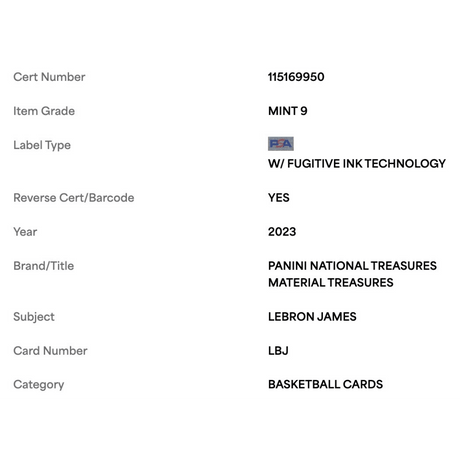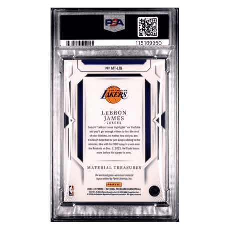 LeBron James PSA 9 2023 Panini National Treasures Material Treasures Patch #d/ 99 Card #LBJ