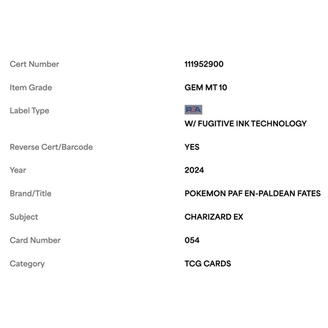 Charizard ex PSA 10 2024 Pokemon PAF EN Paldean Fates Card #054