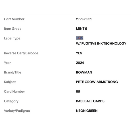 Pete Crow-Armstrong PSA 9 2024 Topps Bowman Neon Green Rookie RC #d /399 Card #85