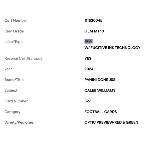 Caleb Williams PSA 10 2024 Panini Donruss Optic Preview Red & Green Rated Rookie Card #327
