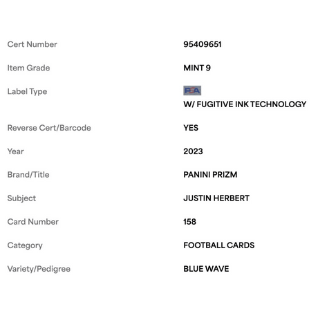 Justin Herbert PSA 9 2023 Panini Prizm Blue Wave #d/ 199 Card #158
