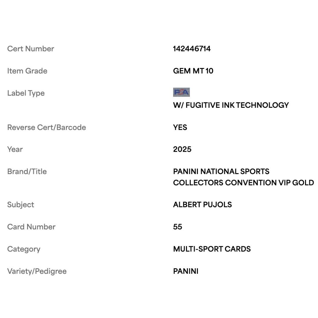 Albert Pujols PSA 10 2025 Panini National Sports Collectors Convention VIP Gold Panini Card #55