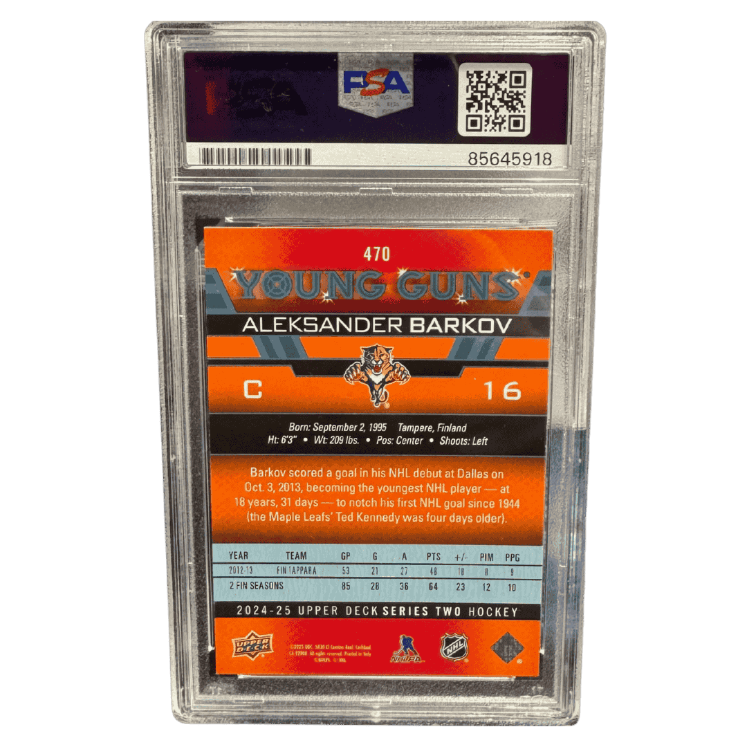 For avid hockey collectors and fans of Aleksander Barkov this 2024-25 Upper Deck Series Two Young Guns Autograph Card #470 is an absolute gem. The autograph is authenticated by PSA. This pristine piece is a must-have addition to any sports card collection.