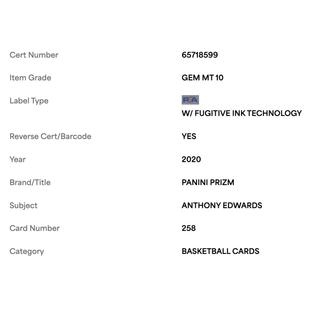 For avid basketball collectors and fans of Anthony Edwards this 2020 Panini Prizm Rookie RC Card #258 in PSA 10 condition is an absolute gem! This pristine piece is a must-have addition to any sports card collection.