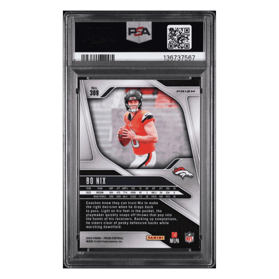 For avid football collectors and fans of Bo Nix this 2024 Panini Prizm Green Wave Rookie RC Card #309 in PSA 9 condition is an absolute gem! This pristine piece is a must-have addition to any sports card collection.