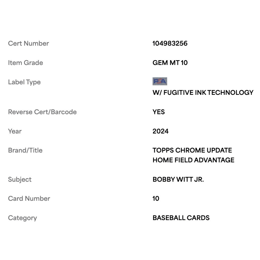 Bobby Witt Jr PSA 10 2024 Topps Chrome Update Home Field Advantage Case Hit Card #10