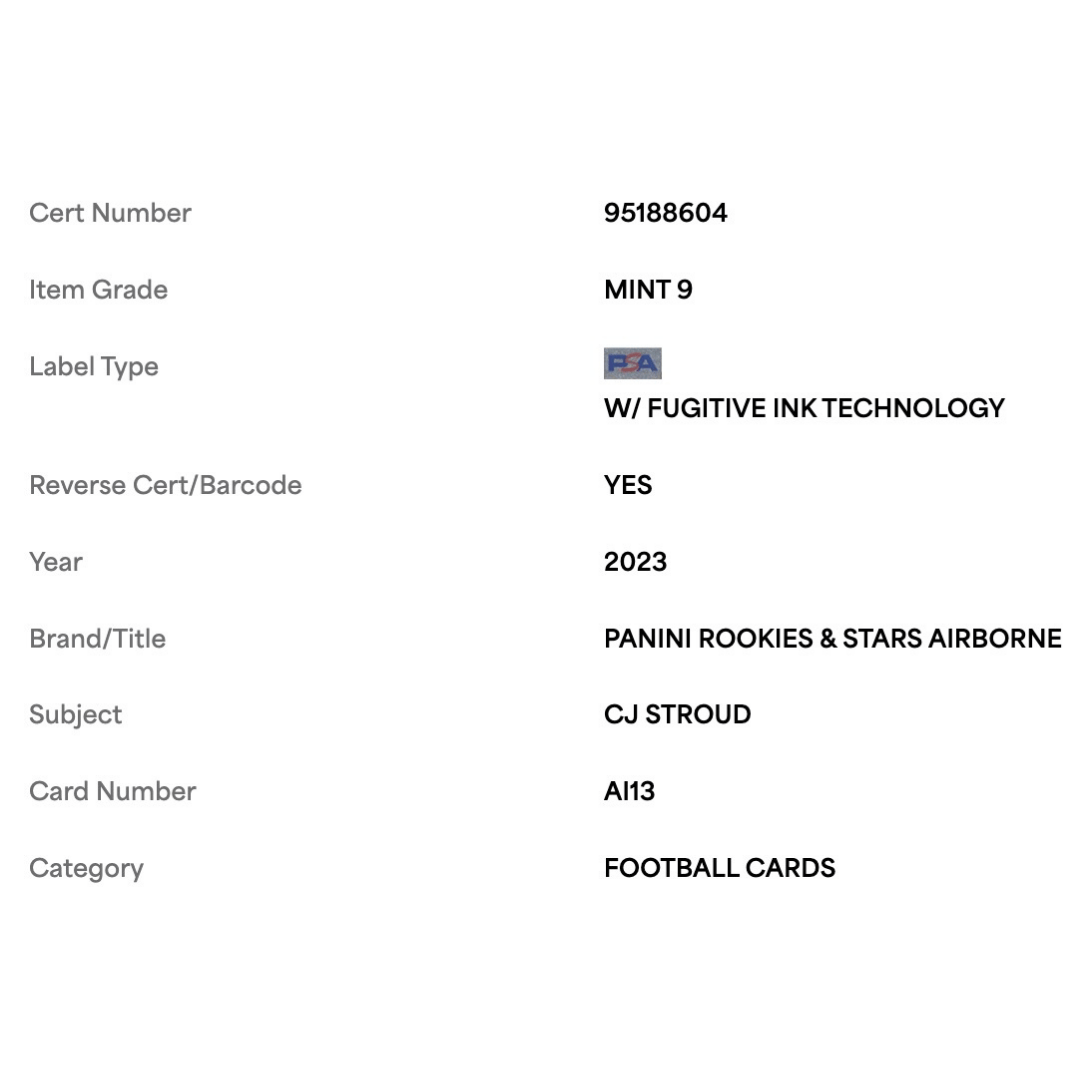 For avid football collectors and fans of C.J. Stroud this 2023 Panini Rookie & Stars Airborne Card #AI13 in PSA 9 condition is an absolute gem! This pristine piece is a must-have addition to any sports card collection.