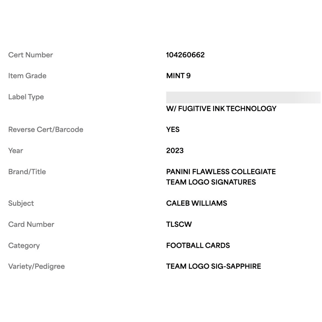 Caleb Williams PSA 9 2023 Panini Flawless Collegiate Team Logo Signature Sapphire Rookie RC #d/ 15 Card #TLSCW