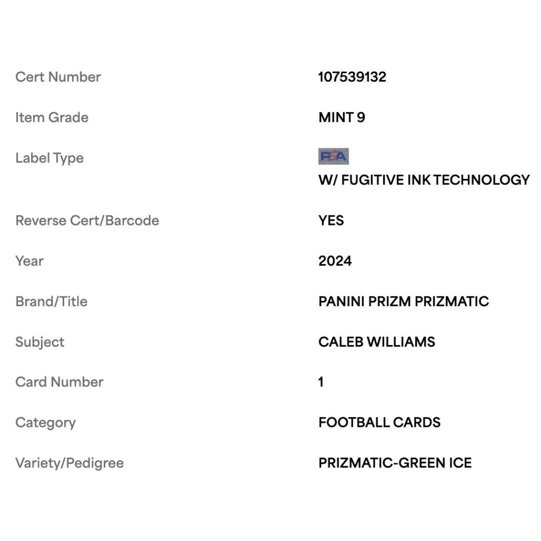 Caleb Williams PSA 9 2024 Panini Prizm Prizmatic Green Ice Rookie RC Card #1