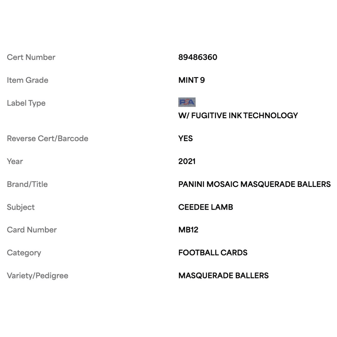 For avid football collectors and fans of CeeDee Lamb this 2021 Panini Mosaic Masquerade Ballers Card #MB12 in PSA 9 condition is an absolute gem! This pristine piece is a must-have addition to any sports card collection.