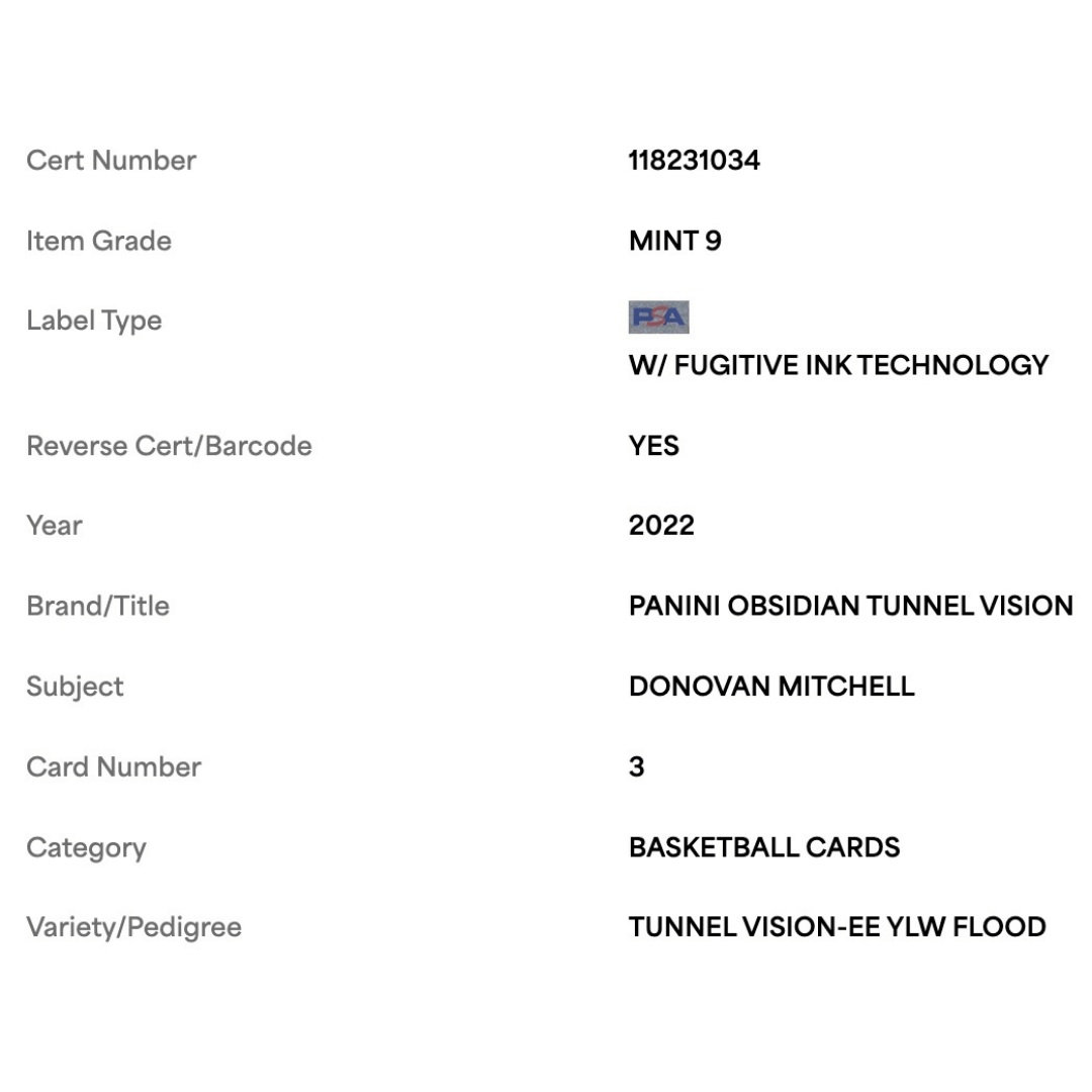 Donovan Mitchell PSA 9 2022 Panini Obsidian Tunnel Vision EE Yellow Flood #1/ 10 Card #3
