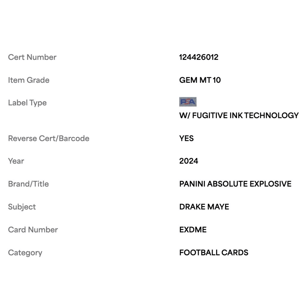 For avid football collectors and fans of Drake Maye this 2024 Panini Absolute Explosive Rookie RC Card #EXDME in PSA 10 condition is an absolute gem! This pristine piece is a must-have addition to any sports card collection.