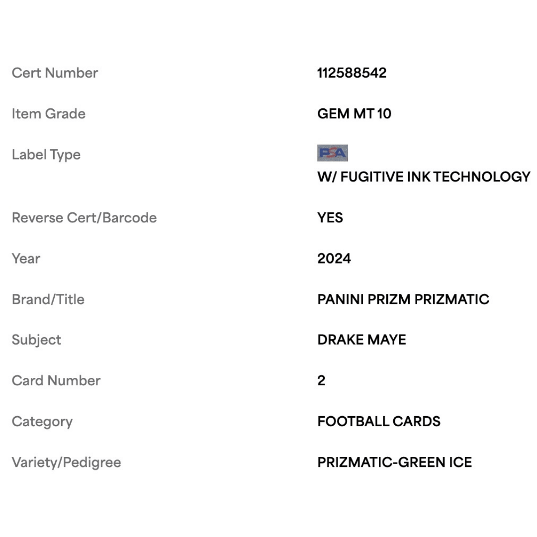 For avid football collectors and fans of Drake Maye this 2024 Panini Prizm Prizmatic Green Ice Rookie RC Card #2 in PSA 10 condition is an absolute gem! This pristine piece is a must-have addition to any sports card collection.