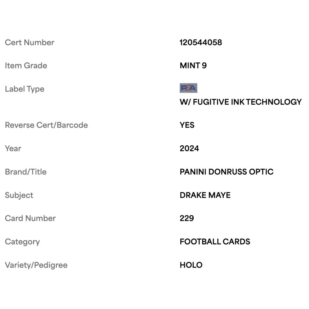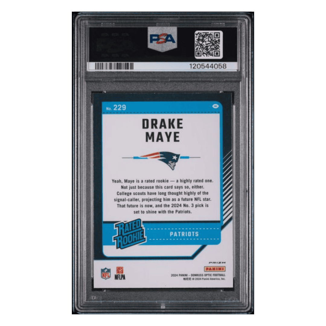 For avid football collectors and fans of Drake Maye this 2024 Panini Donruss Optic Holo Rated Rookie Card #229 in PSA 9 condition is an absolute gem! This pristine piece is a must-have addition to any sports card collection.