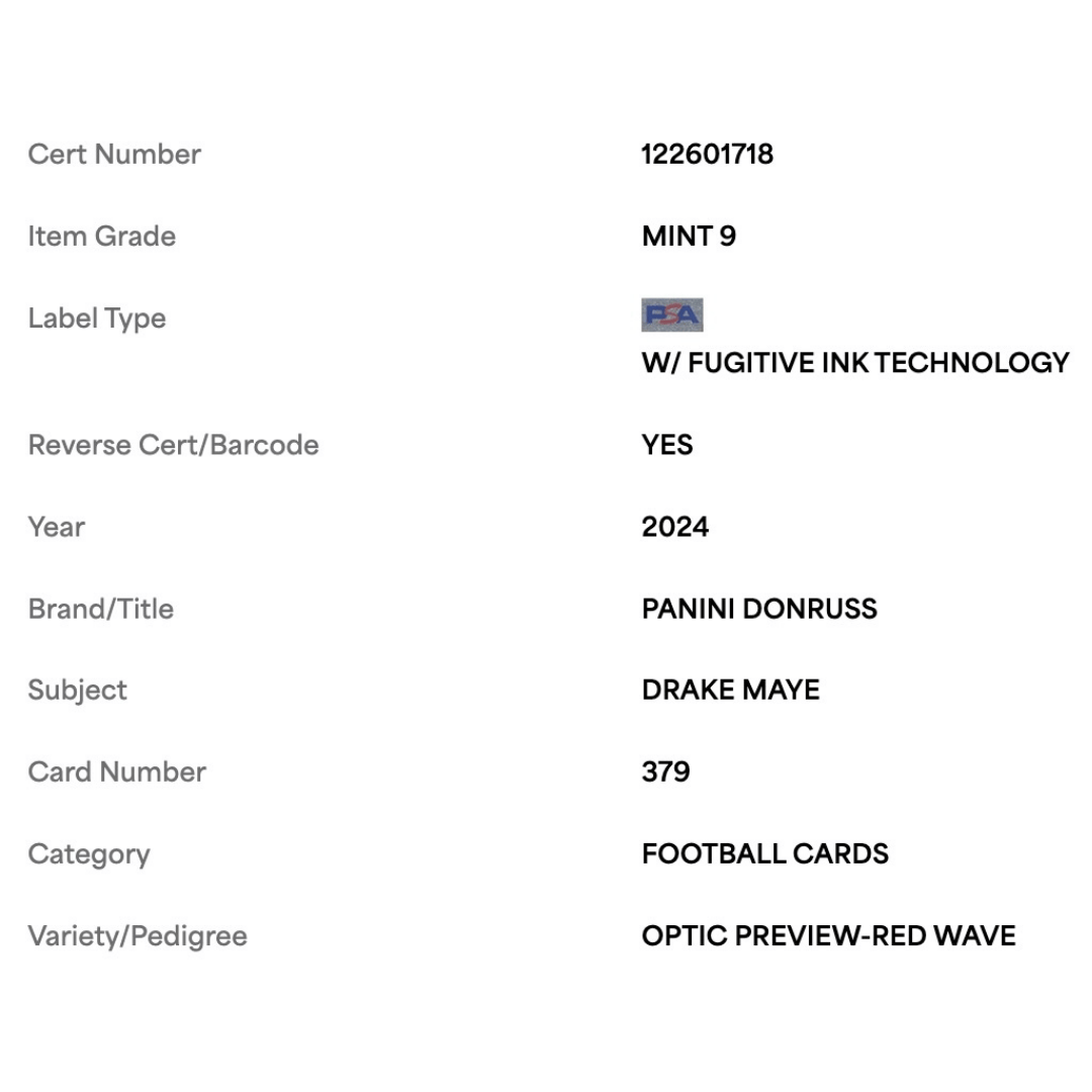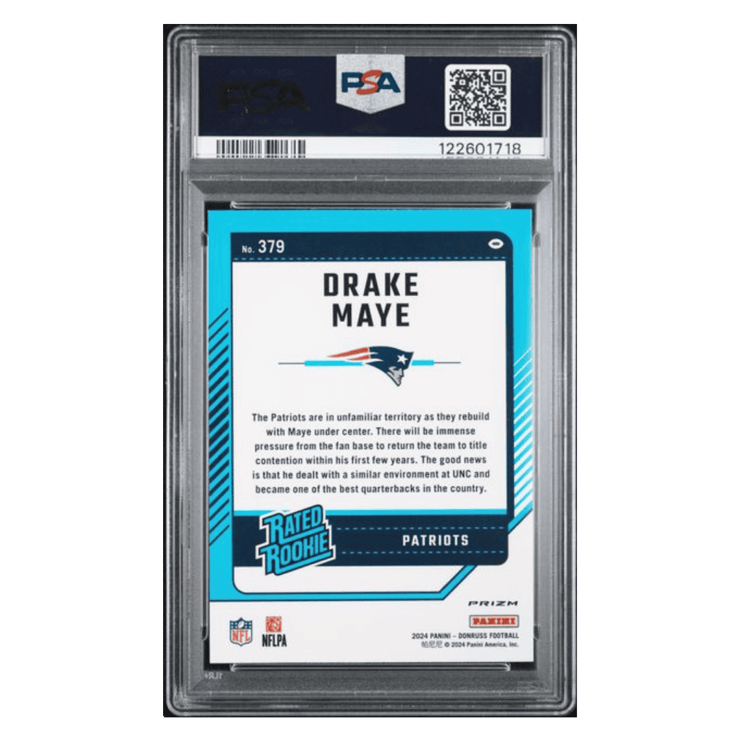 For avid football collectors and fans of Drake Maye this 2024 Panini Donruss Optic Preview Red Wave Rated Rookie Card #379 in PSA 9 condition is an absolute gem! This pristine piece is a must-have addition to any sports card collection.