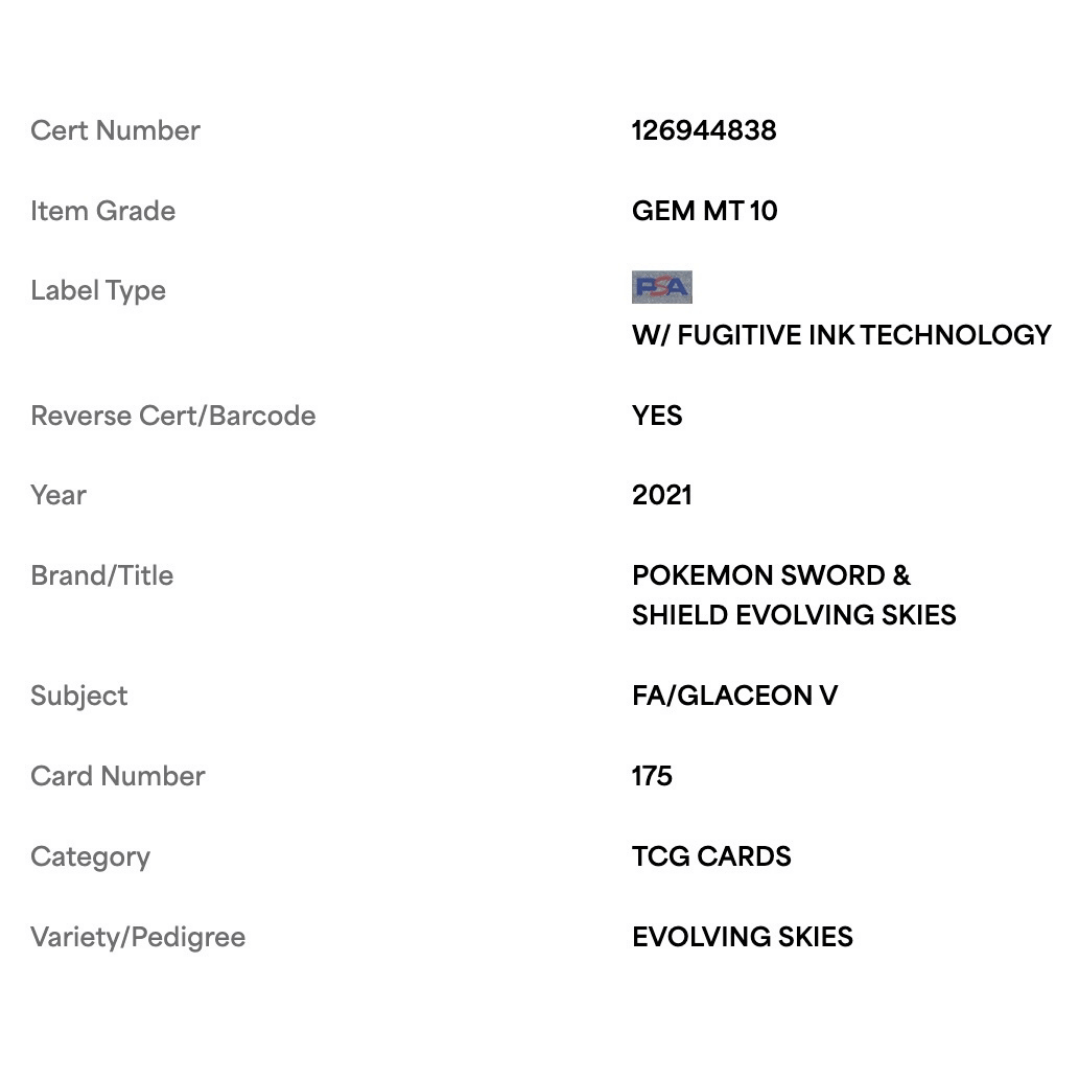 FA/ Glaceon V PSA 10 2021 Pokemon Sword & Shield Evolving Skies Card #175