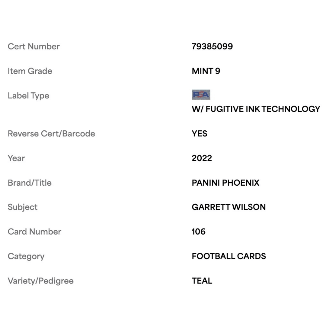 For avid football collectors and fans of Garrett Wilson this 2022 Panini Phoenix Teal Rookie RC #d/ 150 Card #106 in PSA 9 condition is an absolute gem! This pristine piece is a must-have addition to any sports card collection.