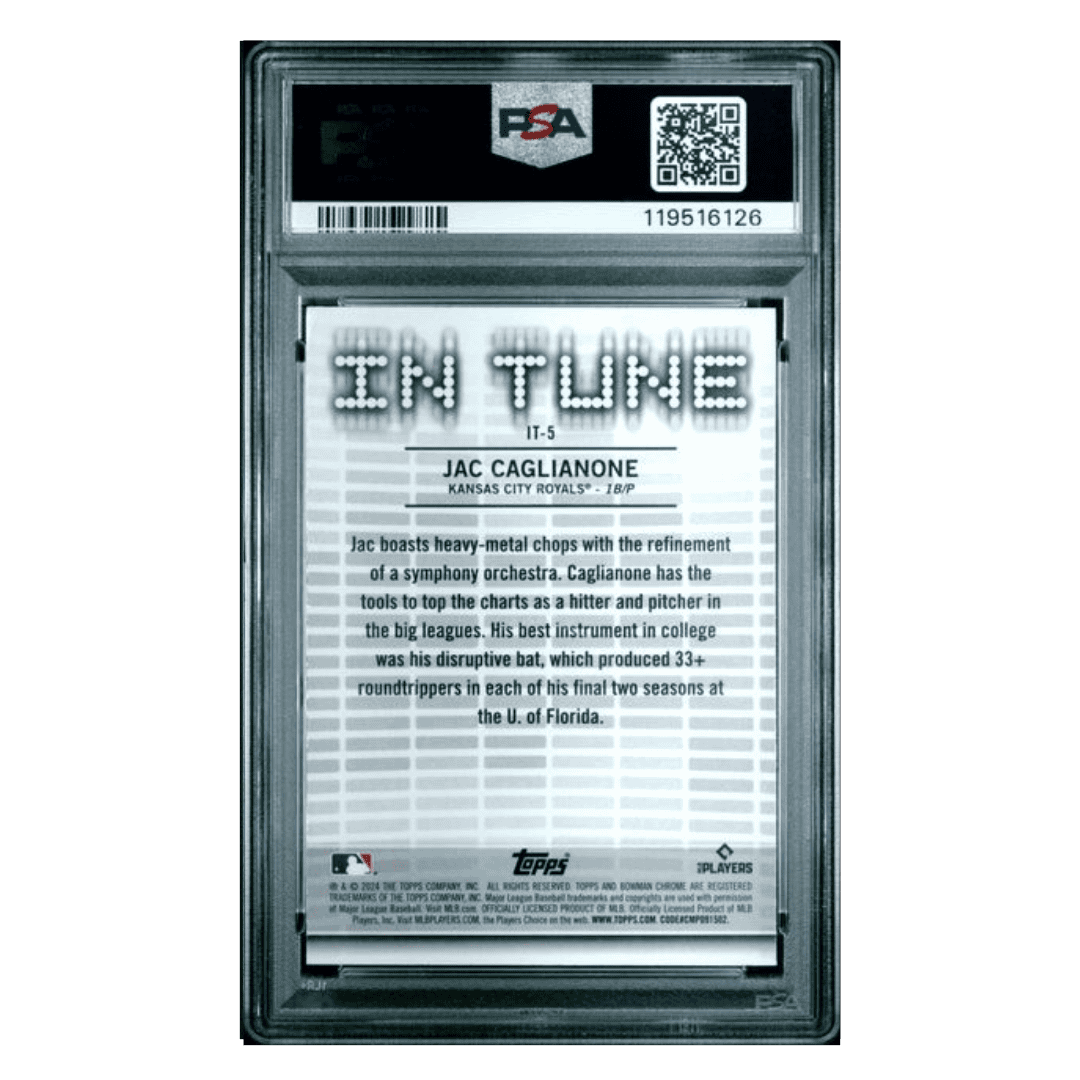 For avid baseball collectors and fans of Jac Caglianone this 2024 Topps Bowman Draft In Tune Card #IT5 in PSA 10 condition is an absolute gem! This pristine piece is a must-have addition to any sports card collection.